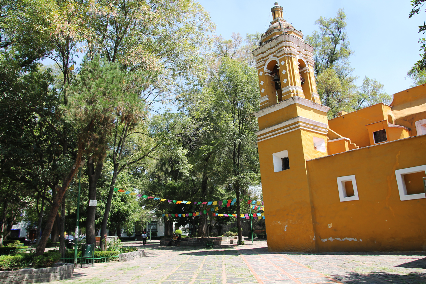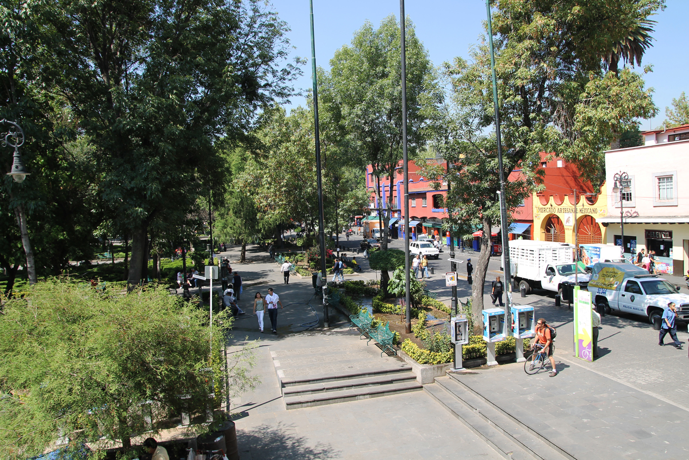 Nous partons prendre le petit-déjeuner (enchiladas y mole) en terrasse et nous promenons dans ce charmant quartier qu’est Coyoacan : dans un style colonial espagnol très coloré, pavé, mercado (marché) de type halles qui fait également office de foire-fouille où l’on peut également s’y trouver quelques coins pour se restaurer en tacos ou autres tostadas (idem mais la tortilla est frite).