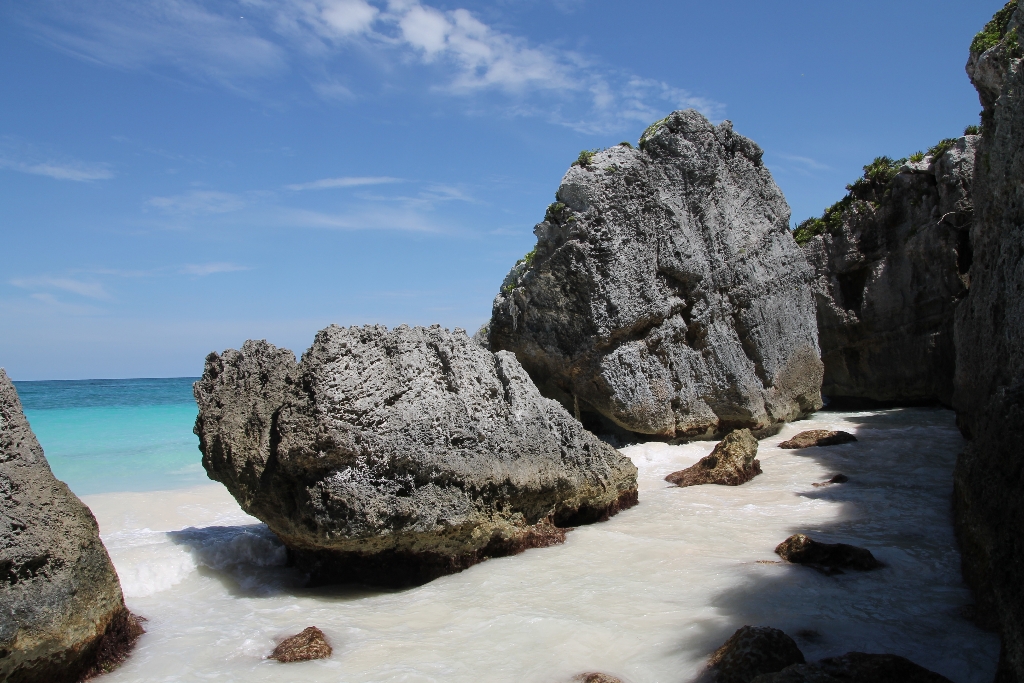 Ça y est j’y suis arrivé, et puis le transport (van collectif) était bien moins cher. Une dizaine de minutes de marche (oui oui j’ai encore mes grosses cloques sous les pieds) pour arriver à l’entrée du site archéologique), on marche un petit peu sur un petit sentier qui déboule sur de magnifiques ruines Mayas qui surplombent la mer. Ça donne vraiment envie d’avoir habité ce village (ou ville) à l’époque : de superbes bâtiments de pierres avec une vue sur une mer bleue et limpide, les mots me manquent mais je peux juste ajouter qu’en plus des ruines, on peut tout aussi bien aller se baigner en même temps, assez rare pour la visite d’un site historique…